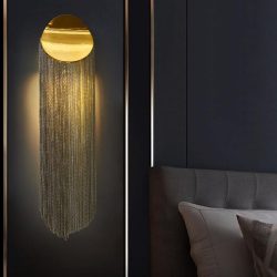 WALL LIGHT MASTER BEDROOM(FIRST FLOOR)Material:Metal + aluminum chainColor:Silver/GoldLamp holder:G9*2Lamp Body(cm):D26*H58(Excluding the bulb)